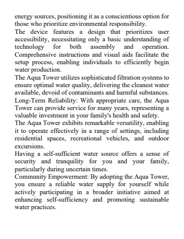 energy sources, positioning it as a conscientious option for those who prioritize environmental responsibility.The device features a design that prioritizes user accessibility, necessitating only a basic understanding of technology for both assembly and operation. Comprehensive instructions and visual aids facilitate the setup process, enabling individuals to efficiently begin water production.The Aqua Tower utilizes sophisticated filtration systems to ensure optimal water quality, delivering the cleanest water available, devoid of contaminants and harmful substances.Long-Term Reliability: With appropriate care, the Aqua Tower can provide service for many years, representing a valuable investment in your family's health and safety.The Aqua Tower exhibits remarkable versatility, enabling it to operate effectively in a range of settings, including residential spaces, recreational vehicles, and outdoor excursions.Having a self-sufficient water source offers a sense of security and tranquility for you and your family, particularly during uncertain times.Community Empowerment: By adopting the Aqua Tower, you ensure a reliable water supply for yourself while actively participating in a broader initiative aimed at enhancing self-sufficiency and promoting sustainable water practices.