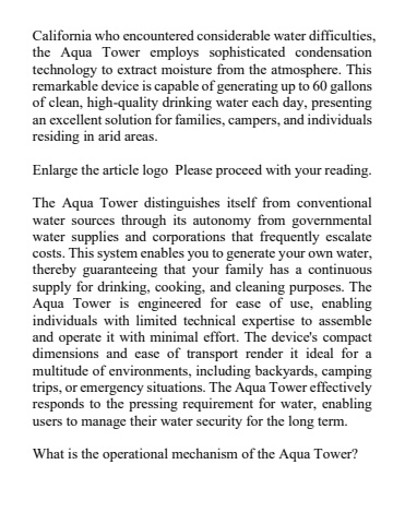 California who encountered considerable water difficulties, the Aqua Tower employs sophisticated condensation technology to extract moisture from the atmosphere. This remarkable device is capable of generating up to 60 gallons of clean, high-quality drinking water each day, presenting an excellent solution for families, campers, and individuals residing in arid areas.Enlarge the article logo Please proceed with your reading.The Aqua Tower distinguishes itself from conventional water sources through its autonomy from governmental water supplies and corporations that frequently escalate costs. This system enables you to generate your own water, thereby guaranteeing that your family has a continuous supply for drinking, cooking, and cleaning purposes. The Aqua Tower is engineered for ease of use, enabling individuals with limited technical expertise to assemble and operate it with minimal effort. The device's compact dimensions and ease of transport render it ideal for a multitude of environments, including backyards, camping trips, or emergency situations. The Aqua Tower effectively responds to the pressing requirement for water, enabling users to manage their water security for the long term.What is the operational mechanism of the Aqua Tower?