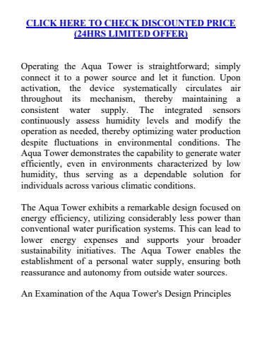 CLICK HERE TO CHECK DISCOUNTED PRICE (24HRS LIMITED OFFER)Operating the Aqua Tower is straightforward; simply connect it to a power source and let it function. Upon activation, the device systematically circulates air throughout its mechanism, thereby maintaining a consistent water supply. The integrated sensors continuously assess humidity levels and modify the operation as needed, thereby optimizing water production despite fluctuations in environmental conditions. The Aqua Tower demonstrates the capability to generate water efficiently, even in environments characterized by low humidity, thus serving as a dependable solution for individuals across various climatic conditions.The Aqua Tower exhibits a remarkable design focused on energy efficiency, utilizing considerably less power than conventional water purification systems. This can lead to lower energy expenses and supports your broader sustainability initiatives. The Aqua Tower enables the establishment of a personal water supply, ensuring both reassurance and autonomy from outside water sources.An Examination of the Aqua Tower's Design Principles