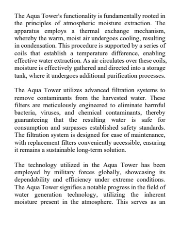 The Aqua Tower's functionality is fundamentally rooted in the principles of atmospheric moisture extraction. The apparatus employs a thermal exchange mechanism, whereby the warm, moist air undergoes cooling, resulting in condensation. This procedure is supported by a series of coils that establish a temperature difference, enabling effective water extraction. As air circulates over these coils, moisture is effectively gathered and directed into a storage tank, where it undergoes additional purification processes.The Aqua Tower utilizes advanced filtration systems to remove contaminants from the harvested water. These filters are meticulously engineered to eliminate harmful bacteria, viruses, and chemical contaminants, thereby guaranteeing that the resulting water is safe for consumption and surpasses established safety standards. The filtration system is designed for ease of maintenance, with replacement filters conveniently accessible, ensuring it remains a sustainable long-term solution.The technology utilized in the Aqua Tower has been employed by military forces globally, showcasing its dependability and efficiency under extreme conditions. The Aqua Tower signifies a notable progress in the field of water generation technology, utilizing the inherent moisture present in the atmosphere. This serves as an