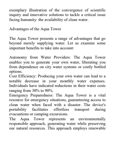 exemplary illustration of the convergence of scientific inquiry and innovative solutions to tackle a critical issue facing humanity: the availability of clean water.Advantages of the Aqua TowerThe Aqua Tower presents a range of advantages that go beyond merely supplying water. Let us examine some important benefits to take into account:Autonomy from Water Providers: The Aqua Tower enables you to generate your own water, liberating you from dependence on city water systems or costly bottled options.Cost Efficiency: Producing your own water can lead to a notable decrease in your monthly water expenses. Individuals have indicated reductions in their water costs ranging from 30% to 90%.Emergency Preparedness: The Aqua Tower is a vital resource for emergency situations, guaranteeing access to clean water when faced with a disaster. The device's portability facilitates effortless transport during evacuations or camping excursions.The Aqua Tower represents an environmentally responsible approach, generating water while preserving our natural resources. This approach employs renewable