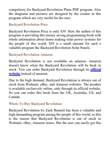 compulsory for Backyard Revolution Plans PDF program. Also the diagrams and pictures are designed by the creator in this program which are very useful for the user.Backyard Revolution PriceBackyard Revolution Price is only $39. Here the author of this program is providing this money saving programming book with whole information about home making solar power systems for the people of this world. $39 is a small amount for such a valuable program the Backyard Revolution Solar Panels.Backyard Revolution AmazonBackyard Revolution is not available on amazon. Amazon doesn't know when the Backyard Revolution will be back in stock. You can order Backyard Revolution through its official websiteinstead of amazon.Due to the high demand, Backyard Revolution is always out of stock from Walmart, eBay, and Amazon websites. The product is available exclusively online, only through its official website. So you can order this book from the UK, Australia, US, and Canada.Where To Buy Backyard RevolutionBackyard Revolution by Zack Bennett has been a valuable and high demanding program among the people of this world, so this is the reason that Backyard Revolution is out of stock in Walmart, eBay, Amazon stores. But the user can easily get this
