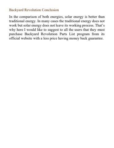 Backyard Revolution ConclusionIn the comparison of both energies, solar energy is better than traditional energy. In many cases the traditional energy does not work but solar energy does not leave its working process. That%u2019s why here I would like to suggest to all the users that they must purchase Backyard Revolution Parts List program from its official website with a less price having money back guarantee.