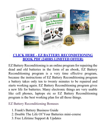 CLICK HERE -EZ BATTERY RECONDITIONING BOOK PDF (24HRS LIMITED OFFER)EZ Battery Reconditioning is an online program for repairing the dead and old batteries in the form of an ebook, EZ Battery Reconditioning program is a very time effective program, becausethe instructions of EZ Battery Reconditioning program a battery takes only ten to twenty minutes to be repaired and starts working again. EZ Battery Reconditioning program gives a new life for batteries. Many electronic things are very usable like cell phones, laptops etc so EZ Battery Reconditioning program is the best working plan for all those things.EZ Battery Reconditioning Bonuses1.Frank's Battery Business Guide2.Double The Life Of Your Batteries mini-course3.Free Lifetime Support & Updates