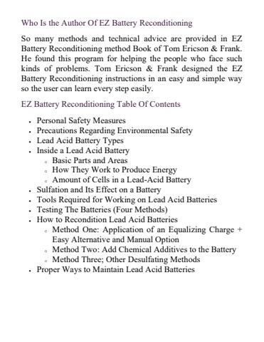 Who Is the Author Of EZ Battery ReconditioningSo many methods and technical advice are provided in EZ Battery Reconditioning method Book of Tom Ericson & Frank. He found this program for helping the people who face such kinds of problems. Tom Ericson & Frank designed the EZ Battery Reconditioning instructions in an easy and simple way so the user can learn every step easily.EZ Battery Reconditioning Table Of Contents%uf0b7Personal Safety Measures%uf0b7Precautions Regarding Environmental Safety%uf0b7Lead Acid Battery Types%uf0b7Inside aLead Acid BatteryoBasic Parts and AreasoHow They Work to Produce EnergyoAmount of Cells in a Lead-Acid Battery%uf0b7Sulfation and Its Effect on a Battery%uf0b7Tools Required for Working on Lead Acid Batteries%uf0b7Testing The Batteries (Four Methods)%uf0b7How to Recondition Lead Acid BatteriesoMethod One: Application of an Equalizing Charge + Easy Alternative and Manual OptionoMethod Two: Add Chemical Additives to the BatteryoMethod Three; Other Desulfating Methods%uf0b7Proper Ways to Maintain Lead Acid Batteries