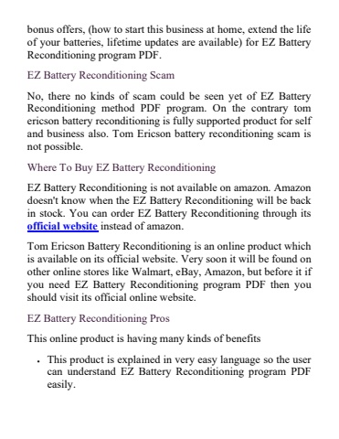 bonus offers, (how to start this business at home, extend the life of your batteries, lifetime updates are available) for EZ Battery Reconditioning program PDF.EZ Battery Reconditioning ScamNo, there no kinds of scam could be seen yet of EZ Battery Reconditioning method PDF program. On the contrary tom ericson battery reconditioning is fully supported product for self and business also. Tom Ericson battery reconditioning scam is not possible.Where To Buy EZ Battery ReconditioningEZ Battery Reconditioning is not available on amazon. Amazon doesn't know when the EZ Battery Reconditioning will be back in stock. You can order EZ Battery Reconditioning through its official websiteinstead of amazon.Tom Ericson Battery Reconditioning is an online product which is available on its official website. Very soon it will be found on other online stores like Walmart, eBay, Amazon, but before it if you need EZ Battery Reconditioning program PDF then you should visit its official online website.EZ Battery Reconditioning ProsThis online product is having many kinds of benefits%uf0b7This product is explained in very easy language so the user can understand EZ Battery Reconditioning program PDF easily.