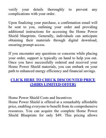verify your details thoroughly to prevent any complications with your order.Upon finalizing your purchase, a confirmation email will be sent to you, outlining your order and providing additional instructions for accessing the Home Power Shield blueprints. Generally, individuals can anticipate obtaining their materials through digital download, ensuring prompt access.If you encounter any questions or concerns while placing your order, support is typically on hand to help you out. Once you have successfully ordered and received your Home Power Shield materials, you can embark on your path to enhanced energy efficiency and financial savings.CLICK HERE TO CHECK DISCOUNTED PRICE (24HRS LIMITED OFFER)Home Power Shield Costs and IncentivesHome Power Shield is offered at a remarkably affordable price, enabling everyone to benefit from its comprehensive resources. You can acquire the complete Home Power Shield Blueprints for only $49. This pricing allows