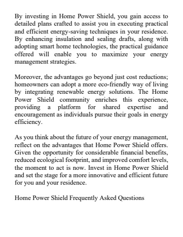 By investing in Home Power Shield, you gain access to detailed plans crafted to assist you in executing practical and efficient energy-saving techniques in your residence. By enhancing insulation and sealing drafts, along with adopting smart home technologies, the practical guidance offered will enable you to maximize your energy management strategies.Moreover, the advantages go beyond just cost reductions; homeowners can adopt a more eco-friendly way of living by integrating renewable energy solutions. The Home Power Shield community enriches this experience, providing a platform for shared expertise and encouragement as individuals pursue their goals in energy efficiency.As you think about the future of your energy management, reflect on the advantages that Home Power Shield offers. Given the opportunity for considerable financial benefits, reduced ecological footprint, and improved comfort levels, the moment to act is now. Invest in Home Power Shield and set the stage for a more innovative and efficient future for you and your residence.Home Power Shield Frequently Asked Questions