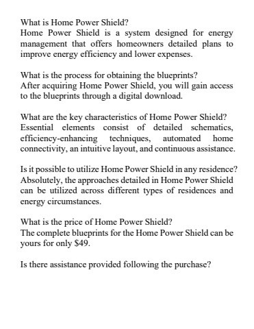 What is Home Power Shield?Home Power Shield is a system designed for energy management that offers homeowners detailed plans to improve energy efficiency and lower expenses.What is the process for obtaining the blueprints?After acquiring Home Power Shield, you will gain access to the blueprints through a digital download.What are the key characteristics of Home Power Shield?Essential elements consist of detailed schematics, efficiency-enhancing techniques, automated home connectivity, an intuitive layout, and continuous assistance.Is it possible to utilize Home Power Shield in any residence?Absolutely, the approaches detailed in Home Power Shield can be utilized across different types of residences and energy circumstances.What is the price of Home Power Shield?The complete blueprints for the Home Power Shield can be yours for only $49.Is there assistance provided following the purchase?