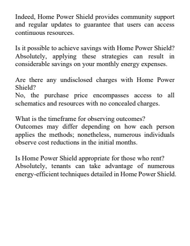 Indeed, Home Power Shield provides community support and regular updates to guarantee that users can access continuous resources.Is it possible to achieve savings with Home Power Shield?Absolutely, applying these strategies can result in considerable savings on your monthly energy expenses.Are there any undisclosed charges with Home Power Shield?No, the purchase price encompasses access to all schematics and resources with no concealed charges.What is the timeframe for observing outcomes?Outcomes may differ depending on how each person applies the methods; nonetheless, numerous individuals observe cost reductions in the initial months.Is Home Power Shield appropriate for those who rent?Absolutely, tenants can take advantage of numerous energy-efficient techniques detailed in Home Power Shield.
