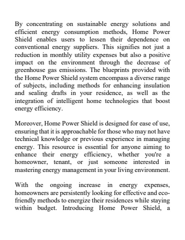 By concentrating on sustainable energy solutions and efficient energy consumption methods, Home Power Shield enables users to lessen their dependence on conventional energy suppliers. This signifies not just a reduction in monthly utility expenses but alsoa positive impact on the environment through the decrease of greenhouse gas emissions. The blueprints provided with the Home Power Shield system encompass a diverse range of subjects, including methods for enhancing insulation and sealing drafts in your residence, as well as the integration of intelligent home technologies that boost energy efficiency.Moreover, Home Power Shield is designed for ease of use, ensuring that it is approachable for those who may not have technical knowledge or previous experience in managing energy. This resource is essential for anyone aiming to enhance their energy efficiency, whether you're a homeowner, tenant, or just someone interested in mastering energy management in your living environment.With the ongoing increase in energy expenses, homeowners are persistently looking for effective and ecofriendly methods to energize their residences while staying within budget. Introducing Home Power Shield, a