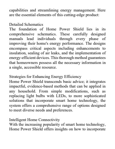 capabilities and streamlining energy management. Here are the essential elements of this cutting-edge product:Detailed SchematicsThe foundation of Home Power Shield lies in its comprehensive schematics. These carefully designed manuals lead individuals through every phase of improving their home's energy performance. The designs encompass critical aspects including enhancements to insulation, sealing of air leaks, and the implementation of energy-efficient devices. This thorough method guarantees that homeowners possess all the necessary information in a single, accessible resource.Strategies for Enhancing Energy EfficiencyHome Power Shield transcends basic advice; it integrates impactful, evidence-based methods that can be applied in any household. From simple modifications, such as replacing light bulbs with LEDs, to more sophisticated solutions that incorporate smart hometechnology, the system offers a comprehensive range of options designed to meet diverse needs and preferences.Intelligent Home ConnectivityWith the increasing popularity of smart home technology, Home Power Shield offers insights on how to incorporate
