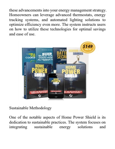 these advancements into your energy management strategy. Homeowners can leverage advanced thermostats, energy tracking systems, and automated lighting solutions to optimize efficiency even more. The system instructs users on how to utilize these technologies for optimal savings and ease of use.Sustainable MethodologyOne of the notable aspects of Home Power Shield is its dedication to sustainable practices. The system focuses on integrating sustainable energy solutions and