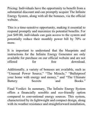 Pricing: Individuals have the opportunity to benefit from a substantial discount and can promptly acquire The Infinite Energy System, along with all the bonuses, via the official website. This is a time-sensitive opportunity, making it essential to respond promptly and maximize its potential benefits. For just $49.00, individuals can gain access to the system and potentially reduce their monthly power bill by 70% or more. It is important to understand that the blueprints and instructions for the Infinite Energy Generator are only available for purchase on our official website and are not offered for free download. Additionally, a variety of bonuses are available, such as %u201cUnusual Power Source,%u201d %u201cThe Miracle,%u201d %u201cBulletproof your home with energy and money,%u201d and %u201cThe Ultimate Battery Secrets and Books.%u201d Final Verdict: In summary, The Infinite Energy System offers a financially sensible and eco-friendly option compared to conventional energy sources. This system, characterized by its lightweight and compact design, along with its weather resistance and straightforward installation,