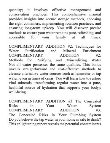 quantity; it involves effective management and conservation practices. This comprehensive manual provides insights into secure storage methods, choosing the right containers, implementing rotation practices, and ensuring long-term upkeep. You will discoverprecise methods to ensure your water remains pure, refreshing, and accessible for your family at all times. COMPLIMENTARY ADDITION #2: Techniques for Water Purification and Mineral Enrichment COMPLIMENTARY ADDITION #2: Methods for Purifying and Mineralizing Water Not all water possesses the same qualities. This bonus unveils straightforward and cost-effective methods to cleanse alternative water sources such as rainwater or tap water, even in times of crisis. You will learn how to restore vital minerals, transforming regular water into a pure, healthful source of hydration that supports your body's well-being. COMPLIMENTARY ADDITION #3 The Concealed Risks in Your Water System COMPLIMENTARY ADDITION #3: The Concealed Risks in Your Plumbing System Do you believe the tap water in your home is safe to drink? This enlightening report reveals the potential contaminants