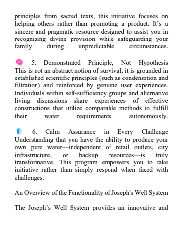principles from sacred texts, this initiative focuses on helping others rather than promoting a product. It%u2019s a sincere and pragmatic resource designed to assist you in recognizing divine provision while safeguarding your family during unpredictable circumstances. %udaae%udaaf%udab05. Demonstrated Principle, Not Hypothesis This is not an abstract notion of survival; it is grounded in established scientific principles (such as condensation and filtration) and reinforced by genuine user experiences. Individuals within self-sufficiency groups and alternative living discussions share experiences of effective constructions that utilize comparable methods to fulfill their water requirements autonomously. %ubb84%ubb85%ubb866. Calm Assurance in Every Challenge Understanding that you have the ability to produce your own pure water%u2014independent of retail outlets, city infrastructure, or backup resources%u2014is truly transformative. This program empowers you to take initiative rather than simply respond when faced with challenges.An Overview of the Functionality of Joseph's Well System The Joseph%u2019s Well System provides an innovative and