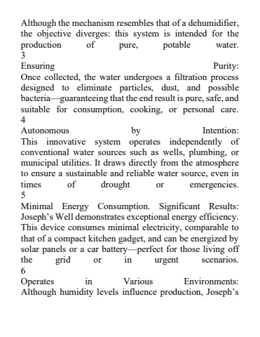 Although the mechanism resembles that of a dehumidifier, the objective diverges: this system is intended for the production of pure, potable water. 3 Ensuring Purity: Once collected, the water undergoes a filtration process designed to eliminate particles, dust, and possible bacteria%u2014guaranteeing that the end result is pure, safe, and suitable for consumption, cooking, or personal care. 4 Autonomous by Intention: This innovative system operates independently of conventional water sources such as wells, plumbing, or municipal utilities. It draws directly from the atmosphere to ensure a sustainable and reliable water source, even in times of drought or emergencies. 5 Minimal Energy Consumption. Significant Results: Joseph%u2019s Well demonstrates exceptional energy efficiency. This device consumes minimal electricity, comparable to that of a compact kitchen gadget, and can be energized by solar panels or a car battery%u2014perfect for those living off the grid or in urgent scenarios. 6 Operates in Various Environments: Although humidity levels influence production, Joseph%u2019s