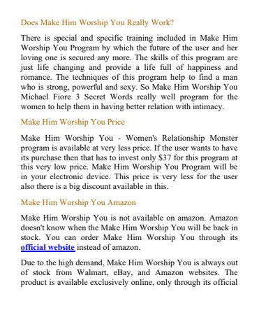 Does Make Him Worship You Really Work?There is special and specific training included in Make Him Worship You Program by which the future of the user and her loving one is secured any more. The skills of this program are just life changing and provide a life full of happiness and romance. The techniques of this program help to find a man who is strong, powerful and sexy. So Make Him Worship You Michael Fiore 3 Secret Words really well program for the women to help them in having better relation with intimacy.Make Him Worship You PriceMake Him Worship You -Women's Relationship Monster program is available at very less price. If the user wants to have its purchase then that has to invest only $37 for this program at this very lowprice. Make Him Worship You Program will be in your electronic device. This price is very less for the user also there is a big discount available in this.Make Him Worship You AmazonMake Him Worship You is not available on amazon. Amazon doesn't know when the Make Him Worship You will be back in stock. You can order Make Him Worship You through its official websiteinstead of amazon.Due to the high demand, Make Him Worship You is always out of stock from Walmart, eBay, and Amazon websites. The product is available exclusively online, only through its official