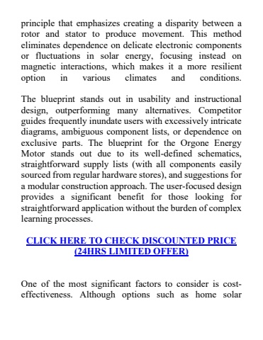 principle that emphasizes creating a disparity between a rotor and stator to produce movement. This method eliminates dependence on delicate electronic components or fluctuations in solar energy, focusing instead on magnetic interactions, which makes it a more resilient option in various climates and conditions. The blueprint stands out in usability and instructional design, outperforming many alternatives. Competitor guides frequently inundate users with excessively intricate diagrams, ambiguous component lists, or dependence on exclusive parts. The blueprint for the Orgone Energy Motor stands out due to its well-defined schematics, straightforward supply lists (with all components easily sourced from regular hardware stores), and suggestions for a modular construction approach. The user-focused design provides a significant benefit for those looking for straightforward application without the burden of complex learning processes. CLICK HERE TO CHECK DISCOUNTED PRICE (24HRS LIMITED OFFER)One of the most significant factors to consider is costeffectiveness. Although options such as home solar