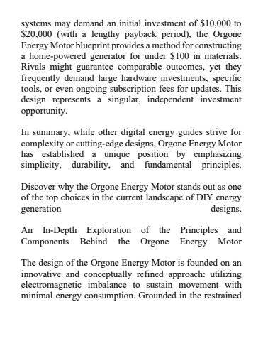systems may demand an initial investment of $10,000 to $20,000 (with a lengthy payback period), the Orgone Energy Motor blueprint provides a method for constructing a home-powered generator for under $100 in materials. Rivals might guarantee comparable outcomes, yet they frequently demand large hardware investments, specific tools, or even ongoing subscription fees for updates. This design represents a singular, independent investment opportunity. In summary, while other digital energy guides strive for complexity or cutting-edge designs, Orgone Energy Motor has established a unique position by emphasizing simplicity, durability, and fundamental principles. Discover why the Orgone Energy Motor stands out as one of the top choices in the current landscape of DIY energy generation designs. An In-Depth Exploration of the Principles and Components Behind the Orgone Energy Motor The design of the Orgone Energy Motor is founded on an innovative and conceptually refined approach: utilizing electromagnetic imbalance to sustain movement with minimal energy consumption. Grounded in the restrained
