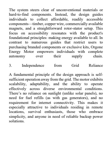 The system steers clear of unconventional materials or hard-to-find components. Instead, the design guides individuals to collect affordable, readily accessible componentstimber, copper wire, commercially available magnets, and a straightforward rotor-stator setup. This focus on accessibility resonates with the product's foundational principles: making energy available to all. In contrast to numerous guides that restrict users to purchasing branded components or exclusive kits, Orgone Energy Motor empowersindividuals with complete autonomy over their supply chain. 3. Independence from Grid Reliance A fundamental principle of the design approach is selfsufficient operation away from the grid. The motor exhibits scalability, adaptability, and the ability to operate effectively across diverse environmental conditions. There%u2019s no reliance on sunlight (unlike solar panels), no need for fuel refills (as with gas generators), and no requirement for internet connectivity. This makes it especially attractive toindividuals residing in remote locations, survival enthusiasts, those who embrace simplicity, and anyone in need of reliable backup power solutions.