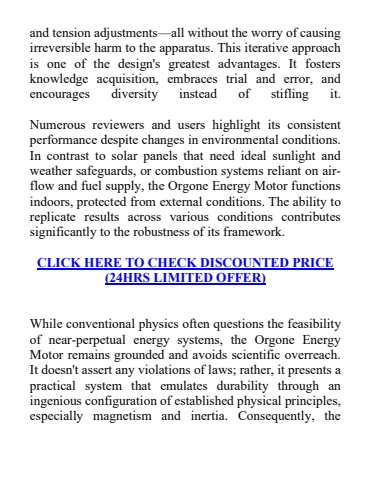 and tension adjustments%u2014all without the worry of causing irreversible harm to the apparatus. This iterative approach is one of the design's greatest advantages. It fosters knowledge acquisition, embraces trial and error, and encourages diversity instead ofstifling it. Numerous reviewers and users highlight its consistent performance despite changes in environmental conditions. In contrast to solar panels that need ideal sunlight and weather safeguards, or combustion systems reliant on airflow and fuel supply, the Orgone Energy Motor functions indoors, protected from external conditions. The ability to replicate results across various conditions contributes significantly to the robustness of its framework. CLICK HERE TO CHECK DISCOUNTED PRICE (24HRS LIMITED OFFER)While conventional physics often questions the feasibility of near-perpetual energy systems, the Orgone Energy Motor remains grounded and avoids scientific overreach. It doesn't assert any violations of laws; rather, it presents a practical system that emulates durability through an ingenious configuration of established physical principles, especially magnetism and inertia. Consequently, the
