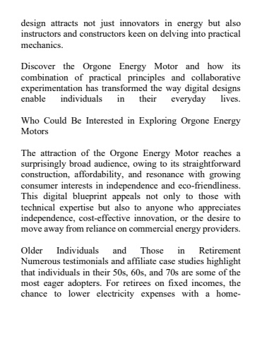 design attracts not just innovators in energy but also instructors and constructors keen on delving into practical mechanics. Discover the Orgone Energy Motor and how its combination of practical principles and collaborative experimentation has transformed the way digital designs enable individuals in their everyday lives. Who Could Be Interested in Exploring Orgone Energy Motors The attraction of the Orgone Energy Motor reaches a surprisingly broad audience, owing to its straightforward construction,affordability, and resonance with growing consumer interests in independence and eco-friendliness. This digital blueprint appeals not only to those with technical expertise but also to anyone who appreciates independence, cost-effective innovation, or thedesire to move away from reliance on commercial energy providers. Older Individuals and Those in Retirement Numerous testimonials and affiliate case studies highlight that individuals in their 50s, 60s, and 70s are some of the most eager adopters. For retirees on fixed incomes, the chance to lower electricity expenses with a home-