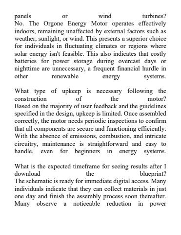 panels or wind turbines? No. The Orgone Energy Motor operates effectively indoors, remaining unaffected by external factors such as weather, sunlight, or wind. This presents a superior choice for individuals in fluctuating climates or regions where solar energy isn't feasible. This also indicates that costly batteries for power storage during overcast days or nighttime are unnecessary, a frequent financial hurdle in other renewable energy systems. What type of upkeep is necessary following the construction of the motor? Based on the majority of user feedback and the guidelines specified in the design, upkeep is limited. Once assembled correctly, the motor needs periodic inspections to confirm that all components are secure and functioning efficiently. With the absence of emissions, combustion, and intricate circuitry, maintenance is straightforward and easy to handle, even for beginners in energy systems. What is the expected timeframe for seeing results after I download the blueprint? The schematic isready for immediate digital access. Many individuals indicate that they can collect materials in just one day and finish the assembly process soon thereafter. Many observe a noticeable reduction in power