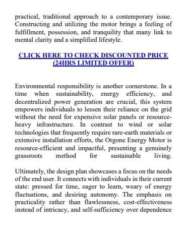 practical, traditional approach to a contemporary issue. Constructing and utilizing the motor brings a feeling of fulfillment, possession, and tranquility that many link to mental clarity and a simplified lifestyle. CLICK HERE TO CHECK DISCOUNTED PRICE (24HRS LIMITED OFFER)Environmental responsibility is another cornerstone. In a time when sustainability, energy efficiency, and decentralized power generation are crucial, this system empowers individuals to lessen their reliance on the grid without the need for expensive solar panels or resourceheavy infrastructure. In contrast to wind or solar technologies that frequently require rare-earth materials or extensive installation efforts, the Orgone Energy Motor is resource-efficient and impactful, presenting a genuinely grassroots method for sustainable living. Ultimately, the design plan showcases a focus on the needs of the end user. It connects with individuals in their current state: pressed for time, eager to learn, weary of energy fluctuations, and desiring autonomy. The emphasis on practicality rather thanflawlessness, cost-effectiveness instead of intricacy, and self-sufficiency over dependence