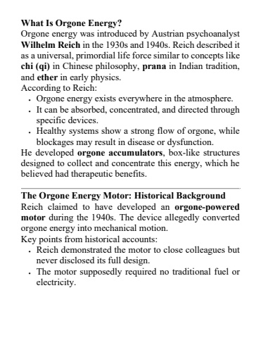 What Is Orgone Energy?Orgone energy was introduced by Austrian psychoanalyst Wilhelm Reichin the 1930s and 1940s. Reich described it as a universal, primordial life force similar to concepts like chi (qi)in Chinese philosophy, pranain Indian tradition, and etherin early physics.According to Reich:xOrgone energy exists everywhere in the atmosphere.xIt can be absorbed, concentrated, and directed through specific devices.xHealthy systems show a strong flow of orgone, while blockages may result in disease or dysfunction.He developed orgone accumulators, box-like structures designed to collect and concentrate this energy, which he believed had therapeutic benefits.The Orgone Energy Motor: Historical BackgroundReich claimed to have developed an orgone-powered motorduring the 1940s. The device allegedly converted orgone energy into mechanical motion.Key points from historical accounts:xReich demonstrated the motor to close colleagues but never disclosed its full design.xThe motor supposedly required no traditional fuel or electricity.