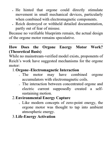 xHe hinted that orgone could directly stimulate movement in small mechanical devices, particularly when combined with electromagnetic components.xReich destroyed or withheld detailed documentation, partly out of fear of misuse.Because no verifiable blueprints remain, the actual design of the orgone motor remains speculative.How Does the Orgone Energy Motor Work? (Theoretical Basis)While no mainstream-verified model exists, proponents of Reich%u2019s work have suggested mechanisms for the orgone motor:1.Orgone%u2013Electromagnetic InteractionoThe motor may have combined orgone accumulators with electromagnetic coils.oThe interaction between concentrated orgone and electric current supposedly created a selfsustaining motion.2.Environmental Energy CaptureoLike modern concepts of zero-point energy, the orgone motor was thought to tap into ambient atmospheric energy.3.Life-Energy Activation