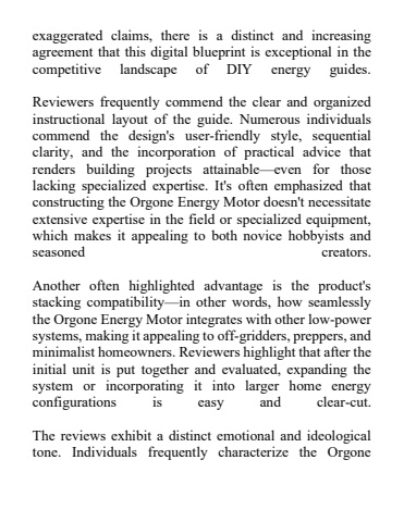 exaggerated claims, there is a distinct and increasing agreement that this digital blueprint is exceptional in the competitive landscape of DIY energy guides. Reviewers frequently commend the clear and organized instructional layout of the guide. Numerous individuals commend the design's user-friendly style, sequential clarity, and the incorporation of practical advice that renders building projects attainable%u2014even for those lacking specialized expertise. It's often emphasized that constructing the OrgoneEnergy Motor doesn't necessitate extensive expertise in the field or specialized equipment, which makes it appealing to both novice hobbyists and seasoned creators. Another often highlighted advantage is the product's stacking compatibility%u2014in other words, how seamlessly the Orgone Energy Motor integrates with other low-power systems, making it appealing to off-gridders, preppers, and minimalist homeowners. Reviewers highlight that after the initial unit is put together and evaluated, expanding the system or incorporating it into larger home energy configurations is easy and clear-cut. The reviews exhibit a distinct emotional and ideological tone. Individuals frequently characterize the Orgone