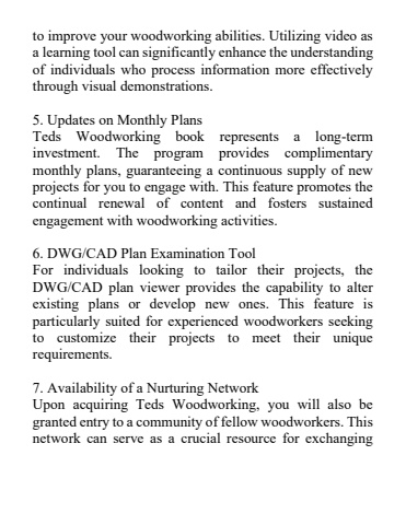 to improve your woodworking abilities. Utilizing video as a learning tool can significantly enhance the understanding of individuals who process information more effectively through visual demonstrations.5. Updates on Monthly PlansTeds Woodworking book represents a long-term investment. The program provides complimentary monthly plans, guaranteeing a continuous supply of new projects for you to engage with. This feature promotes the continual renewal of content and fosters sustainedengagement with woodworking activities.6. DWG/CAD Plan Examination ToolFor individuals looking to tailor their projects, the DWG/CAD plan viewer provides the capability to alter existing plans or develop new ones. This feature is particularly suited for experienced woodworkers seeking to customize their projects to meet theirunique requirements.7. Availability of a Nurturing NetworkUpon acquiring Teds Woodworking, you will also be granted entry to a community of fellow woodworkers. This network can serve as a crucial resource for exchanging