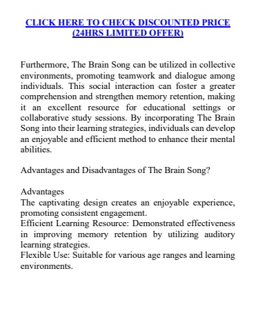 CLICK HERE TO CHECK DISCOUNTED PRICE (24HRS LIMITED OFFER)Furthermore, The Brain Song can be utilized in collective environments, promoting teamwork and dialogue among individuals. This social interaction can foster a greater comprehension and strengthen memory retention, making it an excellent resource for educational settings or collaborative study sessions. By incorporating The Brain Song into their learning strategies, individuals can develop an enjoyable and efficient method to enhance their mental abilities.Advantages and Disadvantages of The Brain Song?AdvantagesThe captivating design creates an enjoyable experience, promoting consistent engagement.Efficient Learning Resource: Demonstrated effectiveness in improving memory retention by utilizing auditory learning strategies.Flexible Use: Suitable for various age ranges and learning environments.