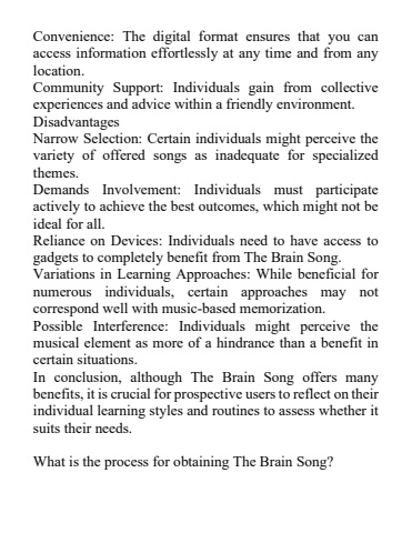 Convenience: The digital format ensures that you can access information effortlessly at any time and from any location.Community Support: Individuals gain from collective experiences and advice within a friendly environment.DisadvantagesNarrow Selection: Certain individuals might perceive the variety of offered songs as inadequate for specialized themes.Demands Involvement: Individuals must participate actively to achieve the best outcomes, which might not be ideal for all.Reliance on Devices: Individuals need to have access to gadgets to completely benefit from The Brain Song.Variations in Learning Approaches: While beneficial for numerous individuals, certain approaches may not correspond well with music-based memorization.Possible Interference: Individuals might perceive the musical element as more of a hindrance than a benefit in certain situations.In conclusion, although The Brain Song offers many benefits, it is crucial for prospective users to reflect on their individual learning styles and routines to assess whether it suits their needs.What is the process for obtaining The Brain Song?