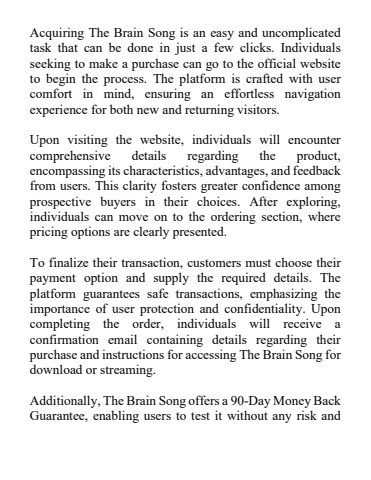 Acquiring The Brain Song is an easy and uncomplicated task that can be done in just a few clicks. Individuals seeking to make a purchase can go to the official website to begin the process. The platform is crafted with user comfort in mind, ensuring an effortless navigation experience for both new and returning visitors.Upon visiting the website, individuals will encounter comprehensive details regarding the product, encompassing its characteristics, advantages, and feedback from users. This clarity fosters greater confidence among prospective buyers in their choices. After exploring, individuals can move on to the ordering section, where pricing options are clearly presented.To finalize their transaction, customers must choose their payment option and supply the required details. The platform guarantees safe transactions, emphasizing the importance of user protection and confidentiality. Upon completing the order, individuals will receive a confirmation email containing details regarding their purchase and instructions for accessing The Brain Song for download or streaming.Additionally, The Brain Song offers a 90-Day Money Back Guarantee, enabling users to test it without any risk and