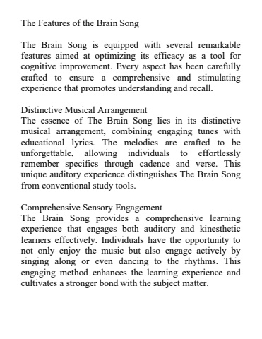 The Featuresof the Brain SongThe Brain Song is equipped with several remarkable features aimed at optimizing its efficacy as a tool for cognitive improvement. Every aspect has been carefully crafted to ensure a comprehensive and stimulating experience that promotes understanding and recall.Distinctive Musical ArrangementThe essence of The Brain Song lies in its distinctive musical arrangement, combining engaging tunes with educational lyrics. The melodies are crafted to be unforgettable, allowing individuals to effortlessly remember specifics through cadence and verse. This unique auditory experience distinguishes The Brain Song from conventional study tools.Comprehensive Sensory EngagementThe Brain Song provides a comprehensive learning experience that engages both auditory and kinesthetic learners effectively. Individuals have the opportunity to not only enjoy the music but also engage actively by singing along or even dancing to the rhythms. This engaging method enhances the learning experience and cultivates a stronger bond with the subject matter.