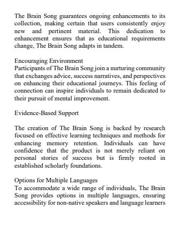 The Brain Song guarantees ongoing enhancements to its collection, making certain that users consistently enjoy new and pertinent material. This dedication to enhancement ensures that as educational requirements change, The Brain Song adapts in tandem.Encouraging EnvironmentParticipants of The Brain Song join a nurturing community that exchanges advice, success narratives, and perspectives on enhancing their educational journeys. This feeling of connection can inspire individuals to remain dedicated to their pursuit of mentalimprovement.Evidence-Based SupportThe creation of The Brain Song is backed by research focused on effective learning techniques and methods for enhancing memory retention. Individuals can have confidence that the product is not merely reliant on personal stories of success but is firmly rooted in established scholarly foundations.Options for Multiple LanguagesTo accommodate a wide range of individuals, The Brain Song provides options in multiple languages, ensuring accessibility for non-native speakers and language learners