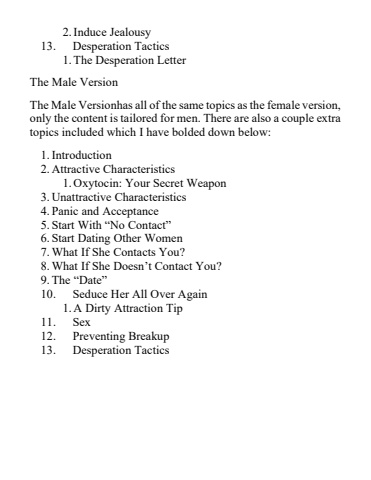 2.Induce Jealousy13.Desperation Tactics1.The Desperation LetterThe Male VersionThe Male Versionhas all of the same topics as the female version, only the content is tailored for men. There are also a couple extra topics included which I have bolded down belo1.Introduction2.Attractive Characteristics1.Oxytocin: Your Secret Weapon3.Unattractive Characteristics4.Panic and Acceptance5.Start With %u201cNo Contact%u201d6.Start Dating Other Women7.What If She Contacts You?8.What If She Doesn%u2019t Contact You?9.The %u201cDate%u201d10.Seduce Her All Over Again1.A Dirty Attraction Tip11.Sex12.Preventing Breakup13.Desperation Tactics