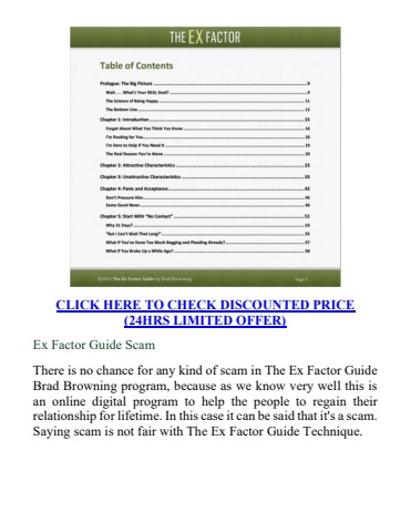 CLICK HERE TO CHECK DISCOUNTED PRICE (24HRS LIMITED OFFER)Ex Factor Guide ScamThere is no chance for any kind of scam in The Ex Factor Guide Brad Browning program, because as we know very well this is an online digital program to help the people to regain their relationship for lifetime. In this case it can be said that it's a scam. Saying scam is not fair with The Ex Factor Guide Technique.