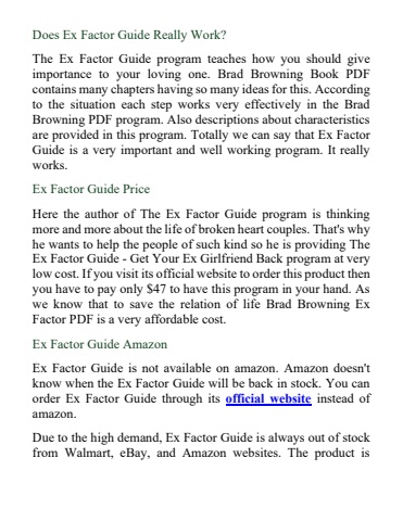 Does Ex Factor Guide Really Work?The Ex Factor Guide program teaches how you should give importance to your lovingone. Brad Browning Book PDF contains many chapters having so many ideas for this. According to the situation each step works very effectively in the Brad Browning PDF program. Also descriptions about characteristics are provided in this program. Totally we can say that Ex Factor Guide is a very important and well working program. It really works.Ex Factor Guide PriceHere the author of The Ex Factor Guide program is thinking more and more about the life of broken heart couples. That's why he wants to helpthe people of such kind so he is providing The Ex Factor Guide -Get Your Ex Girlfriend Back program at very low cost. If you visit its official website to order this product then you have to pay only $47 to have this program in your hand. As we know thatto save the relation of life Brad Browning Ex Factor PDF is a very affordable cost.Ex Factor Guide AmazonEx Factor Guide is not available on amazon. Amazon doesn't know when the Ex Factor Guide will be back in stock. You can order Ex Factor Guide through its official websiteinstead of amazon.Due to the high demand, Ex Factor Guideis always out of stock from Walmart, eBay, and Amazon websites. The product is