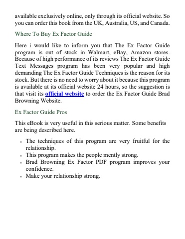 available exclusively online, only through its official website. So you can order this book from the UK, Australia, US, and Canada.Where To Buy Ex Factor GuideHere i would like to inform you that The Ex Factor Guide program is out of stock in Walmart, eBay, Amazon stores. Because of high performance of its reviews The Ex Factor Guide Text Messages program has been very popular and high demanding The Ex Factor Guide Techniques is the reason for its stock. But there is no need to worry about it because this program is available at its official website 24 hours, so the suggestion is that visit its official websiteto order the Ex Factor Guide Brad Browning Website.Ex Factor Guide ProsThis eBook is very useful in this serious matter. Some benefits are being described here.%uf0b7The techniques of this program are very fruitful for the relationship.%uf0b7This program makesthe people mently strong.%uf0b7Brad Browning Ex Factor PDF program improves your confidence.%uf0b7Make your relationship strong.