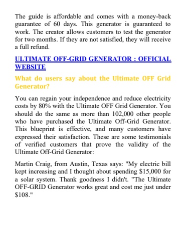 The guide is affordable and comes with a money-back guarantee of 60 days. This generator is guaranteed to work. The creator allows customers to test the generator for two months. If they are not satisfied, they will receive a full refund.ULTIMATE OFF-GRID GENERATOR : OFFICIAL WEBSITEWhat do users say about the Ultimate OFF Grid Generator?You can regain your independence and reduce electricity costs by 80% with the Ultimate OFF Grid Generator. You should do the same as more than 102,000 other people who have purchased the Ultimate Off-Grid Generator. This blueprint is effective, and many customers have expressed their satisfaction. These are some testimonials of verified customers that prove the validity of the Ultimate Off-Grid Generator:Martin Craig, from Austin, Texas says: \kept increasing and I thought about spending $15,000 for a solar system. Thank goodness I didn't. \OFF-GRID Generator works great and cost me just under $108.\